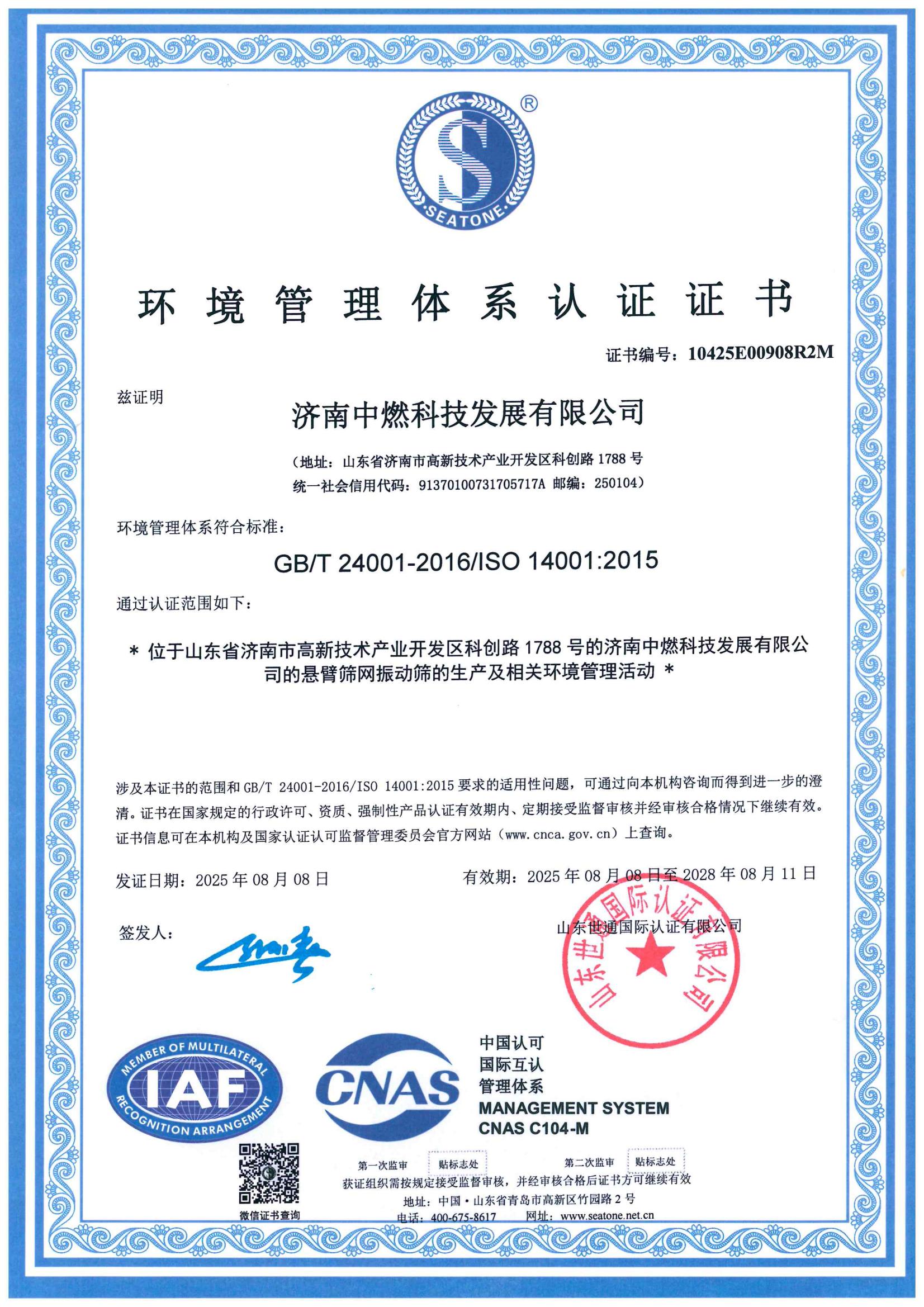 环境管理体系认证证书