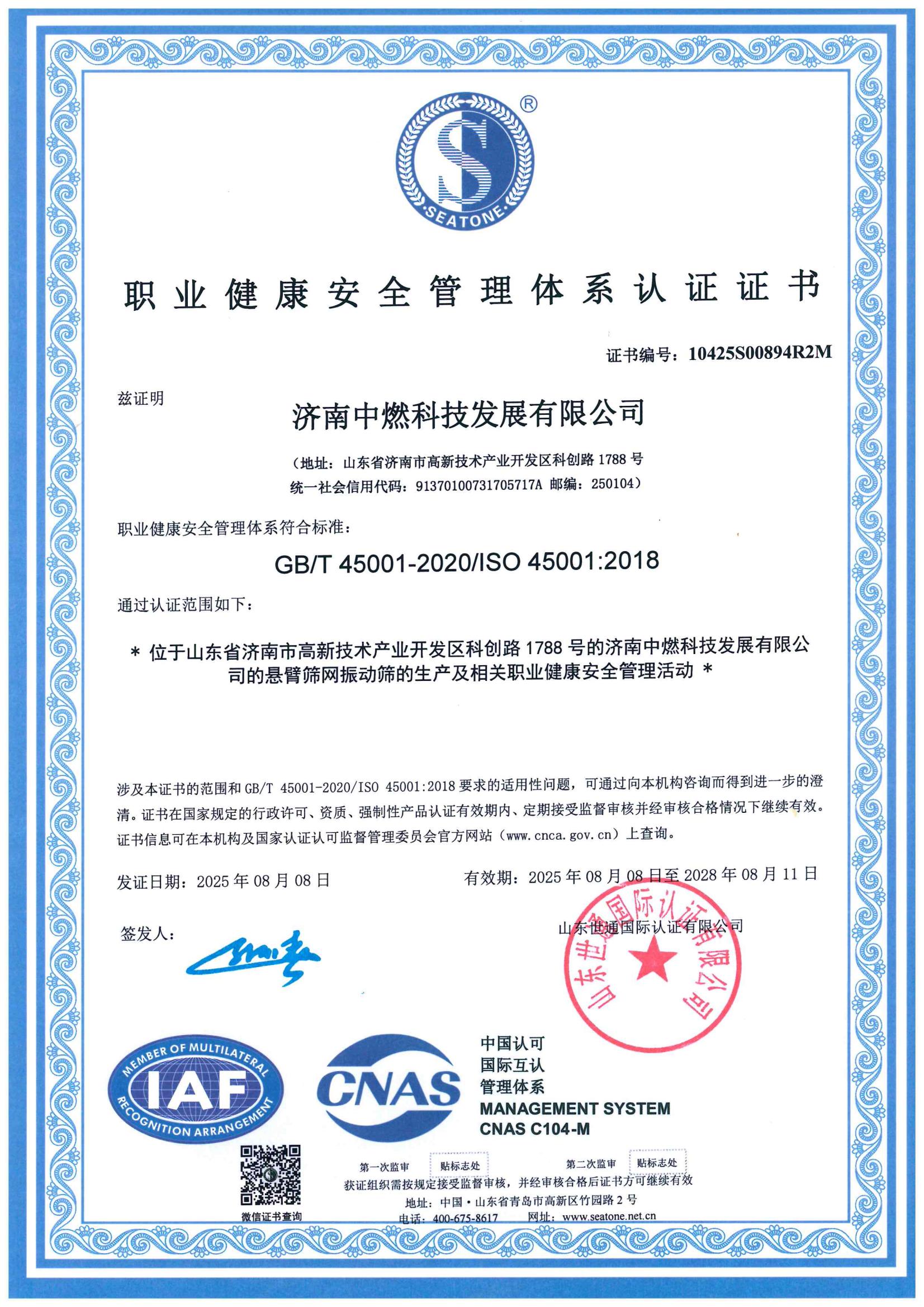 职业健康安全管理体系认证证书