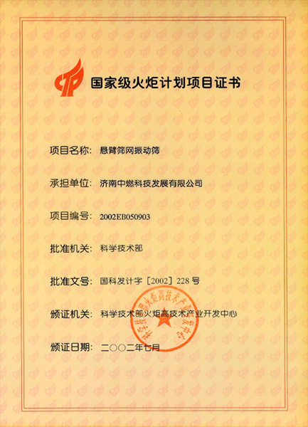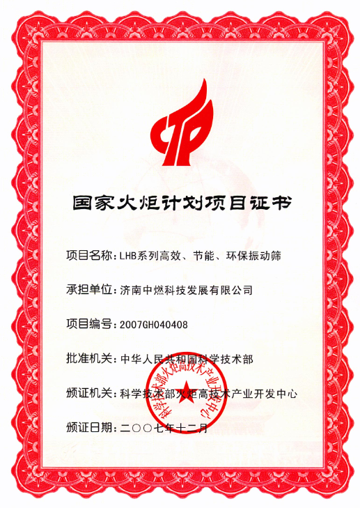 国家火炬计划项目证书(LHB系列高效、节能、环保振动筛)