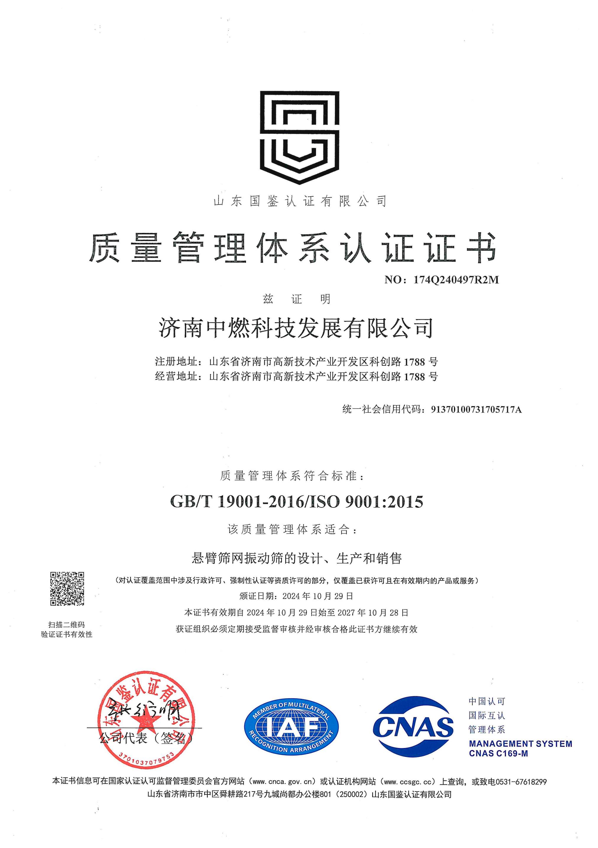 质量体系认证证书